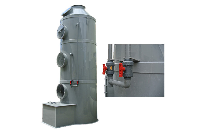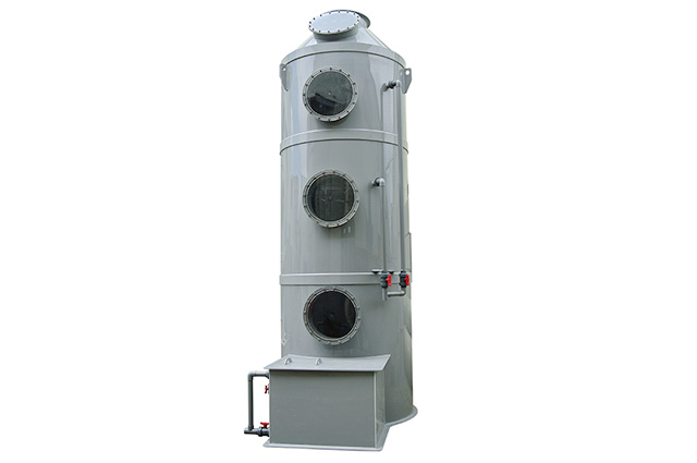 PPs洗滌塔結(jié)構(gòu):洗滌塔由除霧層、噴淋層、填料層、風(fēng)機(jī)、風(fēng)管、塔體、供水箱、供水泵等部分組成。洗滌塔系統(tǒng)的風(fēng)機(jī)組將收集到的廢氣吸入酸霧PPs阻燃洗滌塔內(nèi),流經(jīng)填料層段(氣/液接觸反應(yīng)介質(zhì)),讓廢氣與填充物表面流動(dòng)的藥液(洗滌液)充分接觸,以吸附廢氣中所含的酸性或堿性污物,廢氣經(jīng)過洗滌后,達(dá)標(biāo)排放。